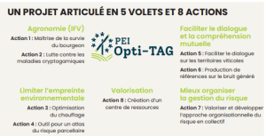 La question du gel de printemps est stratégique et vitale sur le plan économique dans les vignobles du Val de Loire. Le projet Opti-TAG fait suite aux projets SiCtag et Sonotag ayant porté sur l’efficacité et les nuisances sonores de l’utilisation des Tours Antigel (TAG) en viticulture. Il est coordonné par la FRCUMA. Ce nouveau projet PEI, nommé « OPTImisation technique et environnementale des moyens de lutte contre le gel en viticulture par TAG » a été co-construit pour répondre de manière concrète aux problématiques rencontrées par les vignerons en abordant les questions économiques, sociales, agronomiques et environnementales. L’objectif est d’optimiser l’usage des TAG, améliorer leur efficacité, en réduire les impacts négatifs et proposer des outils concrets à destination des collectifs de vignerons, des acteurs de la filière viticole et des territoires viticoles. Il réunit 15 partenaires qui contribuent directement à la réalisation du projet, vignerons, chercheurs, techniciens, spécialistes de l’agronomie, de l’acoustique, de l’environnement ou sociologues. Les livrables attendus du projet portent sur :